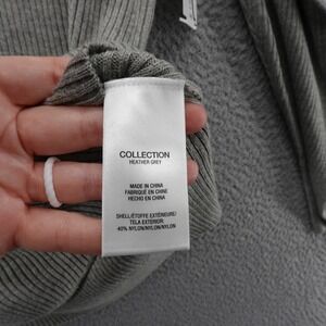 Keywords: JOE'S COLLECTION sweater, women's ribbed sweater, puff sleeve sweater, heather grey sweater, long sleeve sweater, knit top, fashion sweater, casual sweater, stylish sweater, women's apparel, size L sweater, nylon blend sweater, fall fashion