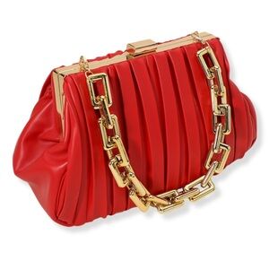 Eye-catching red pleated clutch with a bold gold chain handle. Polished gold hardware complements the vibrant red finish. Compact and stylish for evenings and events. Sleek silhouette that elevates any outfit.