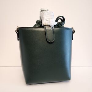 This stylish green leather bucket bag is perfect for any occasion. Its sleek design and gold accents add a touch of elegance to your outfit.