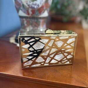 Box/minaudiere style hard clutch with gold geometric cutouts.