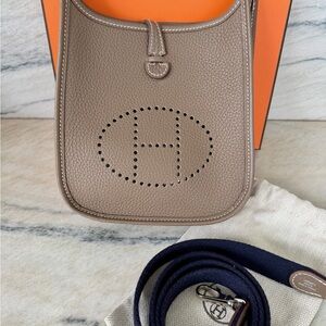 Authentic made in Paris Hermes purse. Technical model is: “Hermès, Etoupe Clemence Mini Evelyne II TPM 16 Gold Hardware” also includes the coveted Bleu Indigo Strap. Bought new in 2023, has been used carefully a handful of occasions. Condition is mint. Comes with all original packaging and dust covers. As you may know, the Hermes market is like Rolex, you cannot just walk into a boutique and get a tier one bag. Obtaining one involves years long waitlists and purchases of many other gateway items.