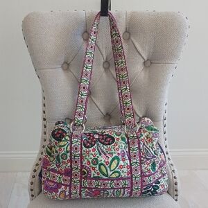 From Vera Bradley, this is a quilted cotton shoulder bag in the retired Viva La Vera floral pattern. This vibrant print features multicolored flowers and leaves against a white background , with prominent purple trim and straps. Roomy enough to be used as a tote or small duffle bag. The front of the bag features 2 slash pockets. The inside of this generously sized bag has a zippered compartment, three additional pockets and a stiff bottom to keep the bag upright. The bag itself and the interior are in very nice, clean condition. NOTE: the very top of the double straps where the bag comes into contact with your hands and the corners where it sits on the ground show wear as is typical in preowned VB cotton bags. Please see photos as I tried to capture these imperfections. Priced is marked accordingly. This bag measures approximately 14" from side seam to side seam and 10" from top seam to bottom. The rigid bottom is about 4.5" from seam to seam. Strap drop is about 11". Clean, smoke free home.