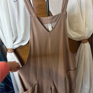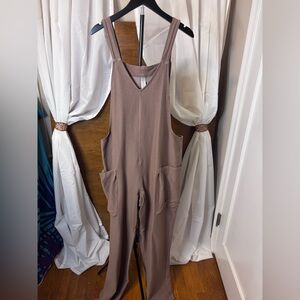 Casual sleeveless jumpsuit with a relaxed wide-leg silhouette. Soft stretch fabric for all-day comfort. Adjustable straps and roomy patch pockets. Easy pull-on style for simple styling.