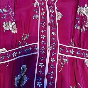 Chic plum maxi dress with floral design. Features long sleeves and a flowing silhouette.