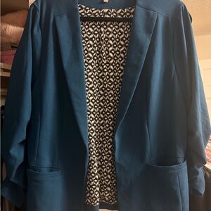 Chic teal blazer with a stylish open front. Features a patterned lining for added flair. Ideal for professional or casual wear.