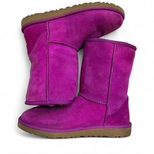 UGG Australia Classic Short boots in a bold pink/purple color. Made with genuine suede and lined with soft sheepskin for warmth and comfort. These iconic boots are perfect for casual wear, cozy outfits, and colder weather.