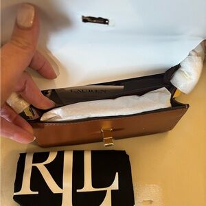 Structured two-tone leather crossbody. Brown flap over white body. Gold RL logo hardware at front. Smooth, polished finish. Elegant everyday to evening piece. B AND NEW NEVER USED