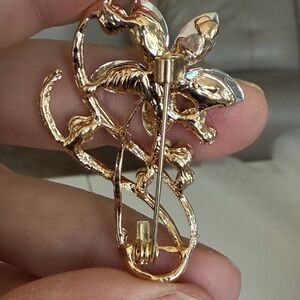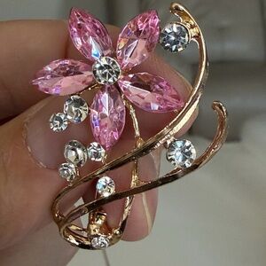 Add a touch of elegance with this stunning pink and gold floral brooch. Perfect for any occasion.