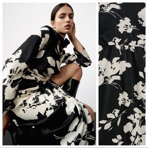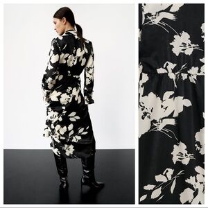 NWT. Zara Black/Cream Satin Effect Floral Print Midi Dress. Size S.