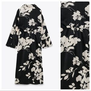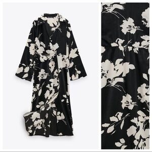 NWT. Zara Black/Cream Satin Effect Floral Print Midi Dress with lapel collar, wrap V-neckline and long sleeves with slit cuffs, front knot detail and elastic waist, lined front buttons closure. Size S. Ref. 9621/261. Pit to pit 18" flat, shoulders 13,5", sleeves 22", waist 14", length 49". 1064.