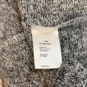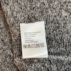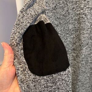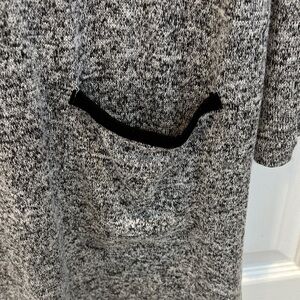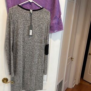 Chic gray dress with black trim. Long sleeves and front pockets. Perfect for casual outings. Thin knit. Patches on back of sleeves.