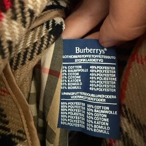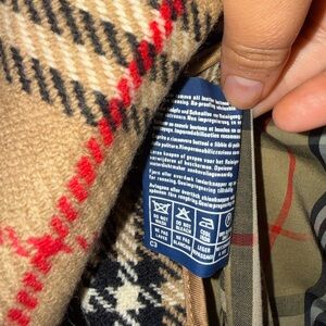 features iconic Burberry plaid lining with wool interior, double-breasted front, adjustable belt, and cuff straps