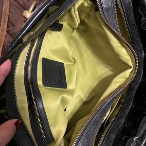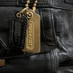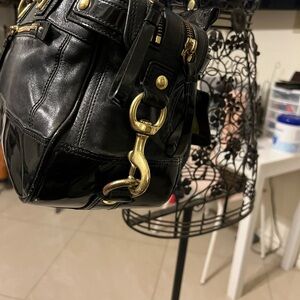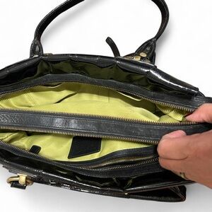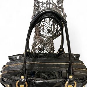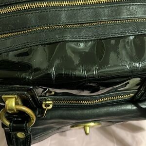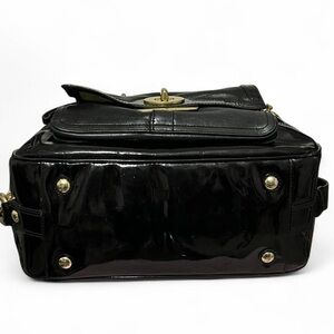 Patent leather shows wear and tear, the shine might be less vibrant in some areas, slight loss of gloss