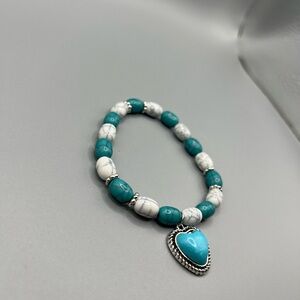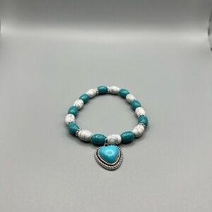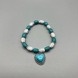Elegant bracelet featuring turquoise and white beads with a heart charm. Perfect for adding a touch of color to any outfit.