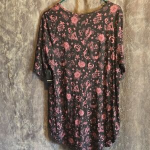Chic black tee with pink graphic design. V-neck and short sleeves. Perfect for casual wear.
