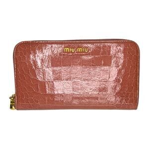 Authentic Miu Miu croc-embossed leather zip-around wallet in a blush pink tone with gold-tone hardware. Features a full zip closure, multiple card slots, bill compartments, and a center zip pocket. The leather is glossy with natural creasing from the croc embossing. A timeless, structured designer wallet with excellent craftsmanship and ample storage.