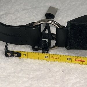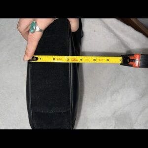 The 2000's Etienne Aigner Genuine Leather Suede Purse features a classic slouch middle crescent shape with a zip closure and a shoulder strap. The exterior material is a combination of leather and suede, with a solid black color. The interior is lined with fabric and has two pockets, one is a zipper compartment and one is an open pocket making it a stylish and durable accessory for women who appreciate practical vintage fashion. The silver rings on the sides of purse add a touch of elegance to the overall design, reflecting the timeless appeal of Y2K fashion trends.