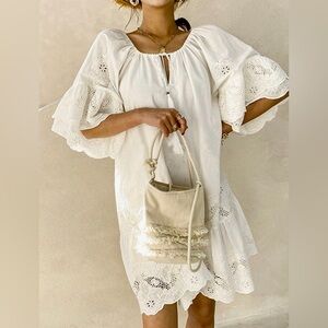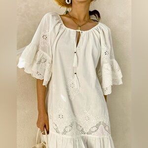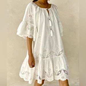 Lightweight white eyelet tunic dress with scalloped hem. Features flutter sleeves and a front tassel tie. Breezy and feminine boho style. Perfect for warm-weather outings.