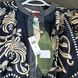 FARM Rio printed mini dress in navy with cream floral motifs. Short puff sleeves and a belted waist. Front button placket with contrast trim. Lightweight, flowy silhouette. Bold botanical print for a statement look.