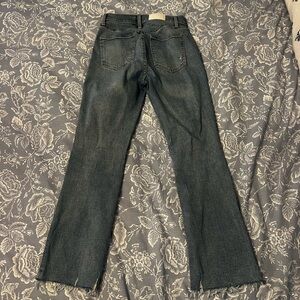 Cropped straight-leg jeans in a light wash. Features subtle distressing and raw hem. Casual, versatile style for everyday wear.