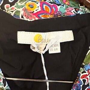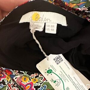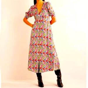 Stunning satin floral midi tea length or max dress by Boden. Features a V-neck and short subtle puff sleeves with covered button detail down front. Silky fabric for a comfortable polished look. Hidden side zip and hidden elasticized sleeve band for comfort. NWT never worn.