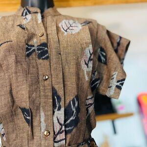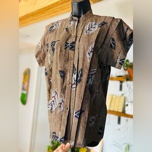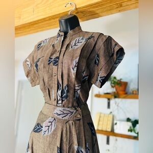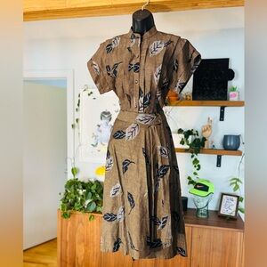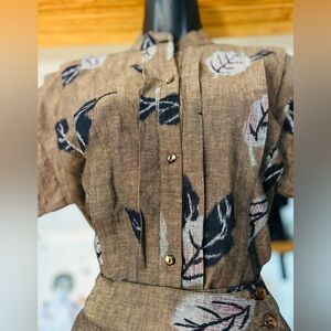 Elevate your wardrobe with this timeless vintage Kenzo two-piece set, likely from the 1980s–1990s based on the classic Kenzo Paris label. This sophisticated ensemble features a structured top and matching skirt in a muted earthy brown print adorned with artistic leaf motifs – a signature of Kenzo's playful yet elegant approach to fashion.