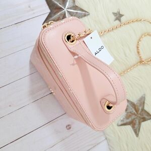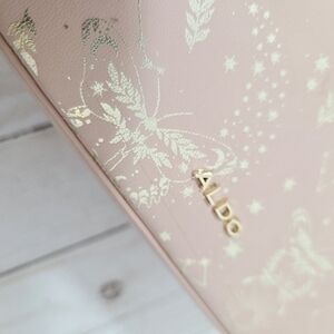Aldo celestial vanity case style crossbody bag. Light pastel pink with metallic gold foil print of butterflies, constellations, stars, vines, etc. Zip around top. Adjustable hold crossbody chain. Interior pockets. Small but roomy.