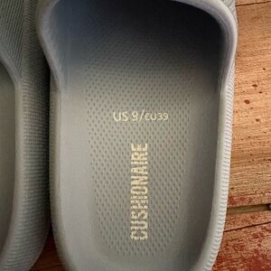 Cushionaire light blue slide mules with a wide ribbed strap. Lightweight, cushioned footbed for all-day comfort. Easy slip-on style perfect for casual wear. Soft light blue color complements summer wardrobes.