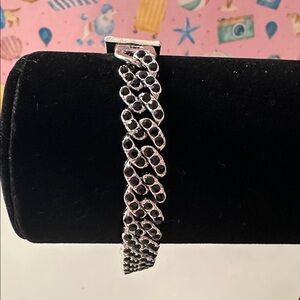 Polished silver-tone women's bracelet with a modern linked buckle accent. Sleek design that complements both casual and dress looks. Lightweight and comfortable for everyday wear. Features a secure clasp and reflective finish.