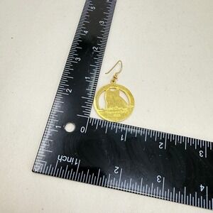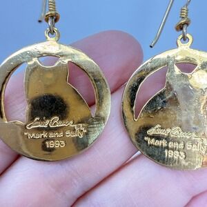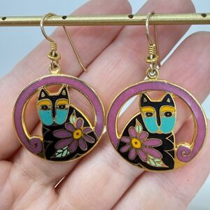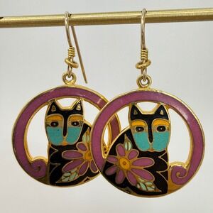 Laurel Burch Mark and Sally Earrings 1993 Enamel Cat Hoop Gold Tone Teal Flower