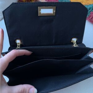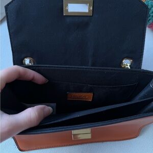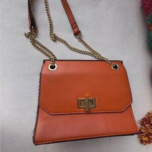 Elegant orange leather shoulder bag with gold chain strap and turn-lock closure. Clean lines and smooth finish for a polished look. Perfect for day-to-night wear.