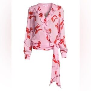 Gorgeous women’s Parker Pink Red Floral Print Silk Blend Pasha Ruffle Wrap Blouse. Fluttering ruffle trim and a banded self-tie waistband adds a 1970s-inspired feel to this floral blouse.
