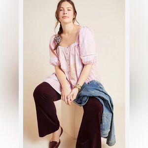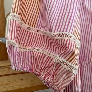 Super cute women’s Anthropologie Maeve White Pink Orange Stripe Gable Tiered Tunic Top. A tiered silhouette, ladder lace trim detail, and horizontal stripes in borage and pink lend this boho seersucker inspired tunic a memorable finish. A relaxed, flowy fit. Lightweight.