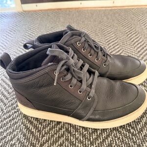 Versatile men's mid-top sneakers with a sleek navy leather upper. Cushioned insole and supportive mid-top design for all-day comfort. Durable rubber outsole provides reliable traction. Classic style that pairs well with casual and smart-casual outfits. UGG Brand.