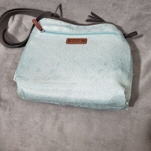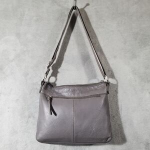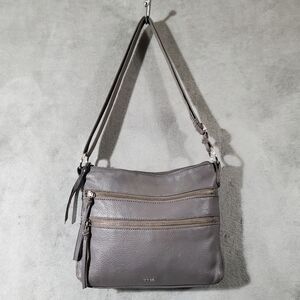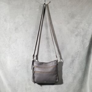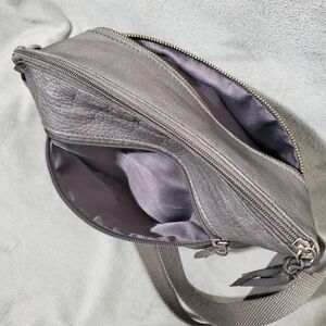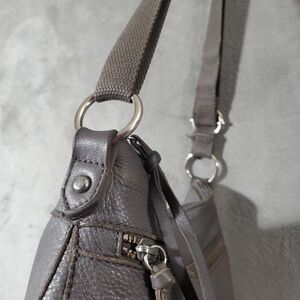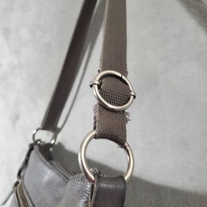 Two front zippered compartments, one zippered compartment on back, zippered main compartment with 2 slip pockets that will accomodate large cell phones and a zippered cosmetic pouch. Adjustable web strap. Silver and brass hardware. Very clean inside.