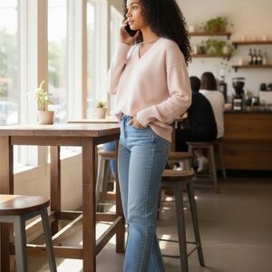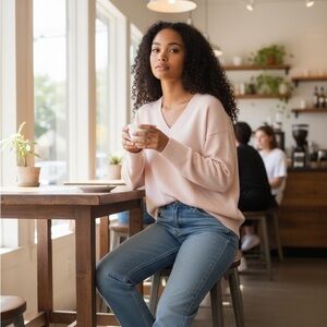 Tags: V-neck, lightweight sweater, soft knit, long sleeve, casual wear, everyday style, minimalist, neutral tone