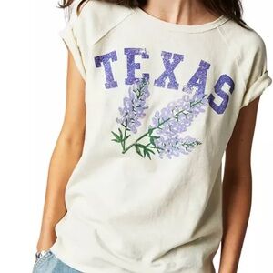 Short sleeve tee with 'Texas' in blue. Cream background. Floral graphic detail.