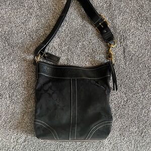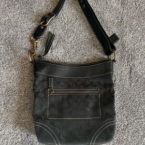Stylish black crossbody bag by Coach. Features signature pattern and gold hardware. Ideal for everyday use.