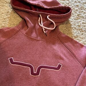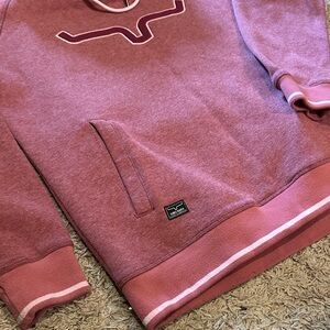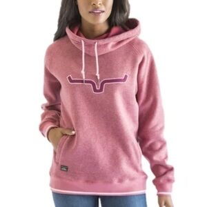 Cozy Kimes Ranch pullover hoodie in rose pink. Features embroidered longhorn logo on front. Hood with drawstring and kangaroo pocket. Ribbed cuffs and hem with contrast trim. Soft, warm fabric for everyday wear.