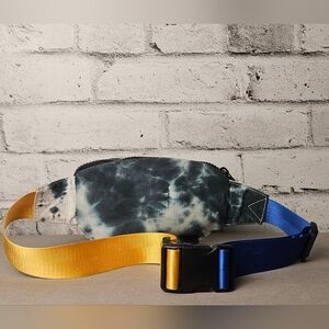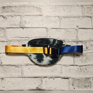 Zara belt bag featuring a unique tie dye pattern with bold colorblock strap in blue and yellow. Super trendy streetwear piece that can be worn as a waist bag or crossbody.