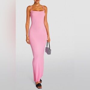 Elegant sleeveless pink Skims bodycon maxi dress. Smooth stretch fabric creates a streamlined silhouette. Vibrant pink color for standout daytime or evening wear. Easy to style for a polished look.