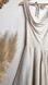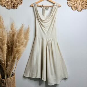 Cowl neckline, A-line skirt, and strappy open back.
