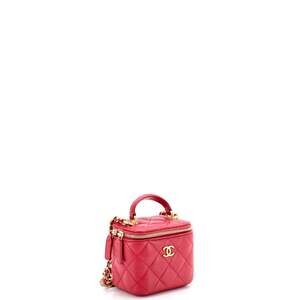 Elevate your style with the Chanel Classic Top Handle Vanity Case. Crafted from luxurious quilted lambskin, this mini version exudes sophistication and elegance. The iconic top handle and chain strap offer versatility, allowing it to be worn as a chic handbag or a statement crossbody. Ideal for carrying essentials in style, this timeless piece is a must-have for fashion enthusiasts seeking a touch of classic Chanel glamour.