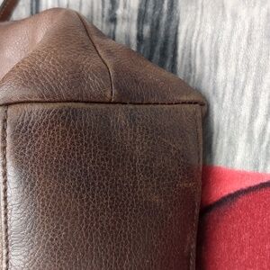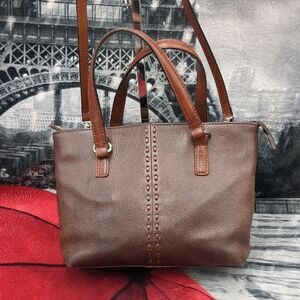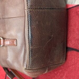 Elegant brown leather tote bag perfect for everyday use. Features a stylish design with durable straps. Ideal for adding a touch of sophistication to any outfit. please note there is some marks on the front and the back of the bag this is normal for leather and creates a beautiful patina. inside is mostly clean. there is a zipper pouch and two two additional pockets. one includes a place for your electronic device. zipper top.