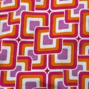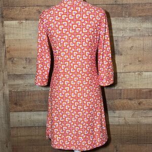 Jude Connally Megan Tunic dress in a women’s size Small. Features a V-neckline, ¾ length sleeves, and a subtle A-line silhouette with fashionable slits on the sleeves and hemline. It effortlessly transitions from day to night. Whether for everyday wear or travel, this dress is the perfect choice for any occasion. Beautiful bold pink and orange geometric pattern. Jude cloth. Pre-loved great condition.