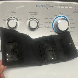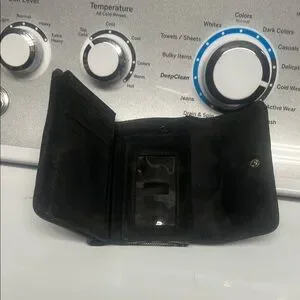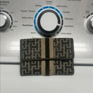 Stylish wallet with a black and cream pattern. Compact and elegant design.