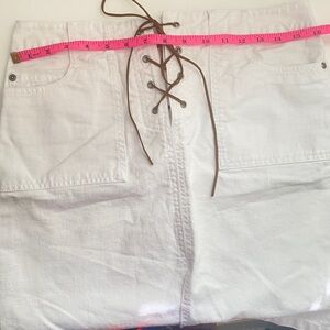 Clean white cargo mini skirt with a front lace-up closure and front slit. Features patch pockets and a straight hem. Casual and breathable for warm days. Easy to style with summer tops or add some boots for a boho style!