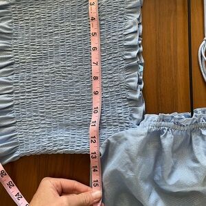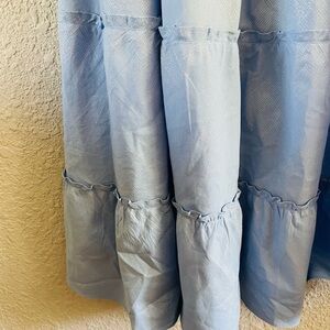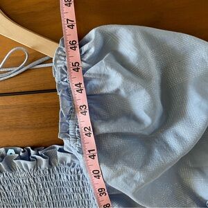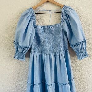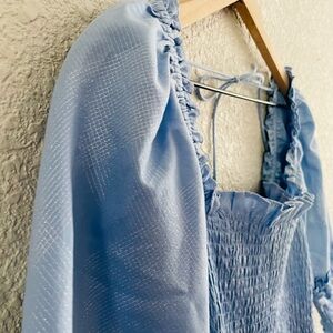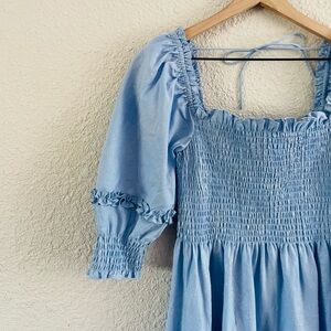 Light blue maxi dress with puff sleeves and smocked bodice. Square neckline with tie back. Tiered skirt with gentle ruffle details. Breezy, feminine silhouette.