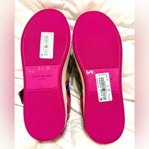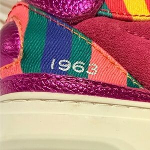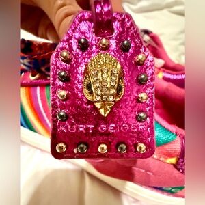 Step into vibrant style with these authentic Kurt Geiger London Southbank Tag Sneakers. Featuring a bold "Fuchsia Combination," these shoes blend high-fashion aesthetics with a playful, eclectic spirit. The eye-catching design features colorful woven stripes, metallic pink leather accents, and the brand's iconic signature hardware.