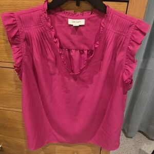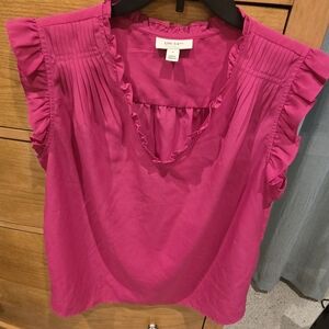 On 34th, women's Fuschia pink blouse with delicate ruffle sleeves and pintuck detailing. Lightweight, feminine design perfect for work or weekend. Vibrant pink color brightens outfits and pairs easily with skirts or jeans. Women's M